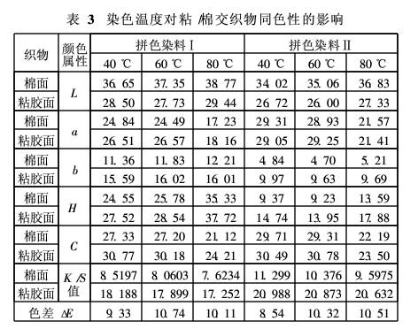 拼色染料對粘/棉交織物分別進行40, 60和80℃浸染,其顏色數據見表3。
