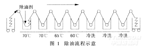 除油在連續(xù)平幅水洗機中進行,坯布在無張力的情況下完全松弛,達到尺寸穩(wěn)定,左中右、頭中尾各處克重一致。除油槽中加除油劑Humectol LYS(不含APEO)2 g/L,溫度為70℃,織物先經(jīng)熱水處理,再經(jīng)幾道逐級降溫熱洗和冷洗,出布落車,上定形機進行高溫預定形。除油流程如圖1。