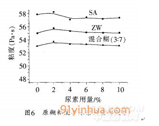 尿素是活性染料印花常用的助溶劑、吸濕劑,除個別染料染深濃色時用量在10%左右外,一般尿素用量不超過6%,圖6為各原糊與尿素的相容性。