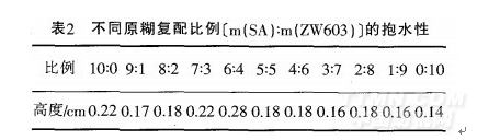 由表2知,單獨合成增稠劑zW603的抱水能力最強,海藻酸鈉抱水性相對較差。隨著ZW603比例的增大,抱水性增強。一般來說原糊的抱水性要求在0.10.2cm之間較為合適.各混合糊的抱水能力均符合此要求