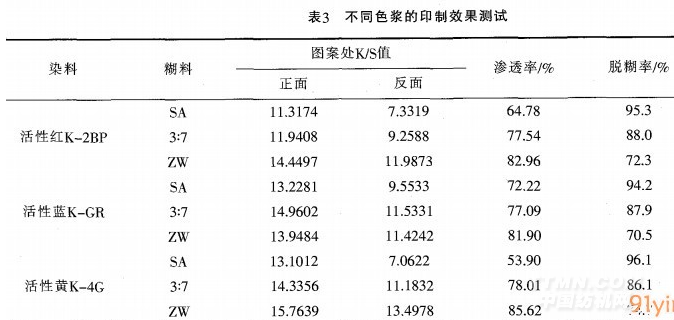 選用三種活性染料配制色漿.印花凈洗后測試滲透性和脫糊率。目測評價(jià)輪廓清晰度.結(jié)果見表3