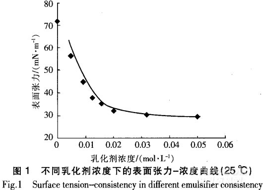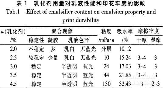 由表1可知,當(dāng)乳化劑用量較低時,會出現(xiàn)凝膠、分層的現(xiàn)象。這是因?yàn)槿榛瘎舛容^低時,僅部分乳膠粒表面被乳化劑分子所覆蓋,故乳膠粒易發(fā)生聚集,由d,-~L膠粒生成大乳膠粒。當(dāng)乳化劑用量增加時,聚合速率提高,乳液的外觀逐漸變得透明且藍(lán)光明顯。這是因?yàn)槿榛瘎┯昧吭酱螅z束數(shù)目越多,成核粒子數(shù)增加,使得乳膠粒子變小,表現(xiàn)為乳液透明且藍(lán)光足。同時,乳膠粒子的粒徑越小,粒子問的相互接觸面積增加,相互作用力增大,表現(xiàn)為表觀粘度提高。但是,當(dāng)乳化劑用量增加時,配料過程易產(chǎn)生泡沫,體系粘度過大操作變得困難,且印制后的耐水性和色牢度均下降。綜合考慮以上因素,復(fù)合乳化劑用量以3%(相對于單體質(zhì)量)為宜。由圖1可知,復(fù)合乳化劑的臨界膠束濃度(CMC)約為0.020mol/L。當(dāng)乳化劑用量(相對于單體質(zhì)量)≥3%時,乳化劑濃度均在CMC以上;當(dāng)乳化劑用量(相對于單體質(zhì)量)為2%和2.5%時,乳化劑濃度在CMC以下。這與表1所示的結(jié)果是一致的,這種不同也是造成表1中的聚合現(xiàn)象和乳液性能有差異的原因所在。2.2自交聯(lián)單體807—3用量的影響