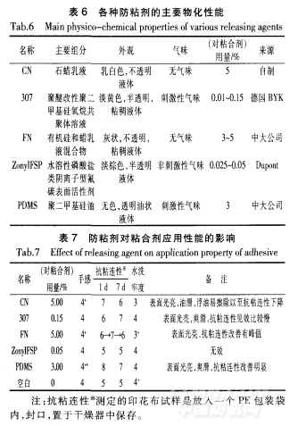 基于有機氟化合物結構的特殊性(含有C—F鍵,鍵能高、鍵長短且表面能很小),賦予了有機氟化合物諸多獨特的性能,如優異的熱穩定性、耐化學藥品性、憎水憎油性和不粘性等,因此,有機氟化合物應該是很好的防粘劑,當然,氟含量不同其不粘性也存在著一定的差異。全氟氟油是效果很好的防粘劑,但是供選擇的品種較少,而且價格昂貴不適宜應用于膠漿的防粘改性。此外,有機氟乳液供選擇的品種也不多,且有些熔融溫度很高,在膠漿的熱處理中未能熔融成膜,從而一直以顆粒狀態存在于膠漿中充當填料,即使含氟量較高,其不粘性也得不到充分體現。表6、表7列出了所選防粘劑的效果與性能比較。