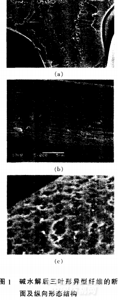 本研究全面考慮潤濕、吸濕、擴(kuò)散、速干幾個功能的關(guān)系,提出了一種新的設(shè)計思路.即合成一系列具有不同特性黏數(shù)的含有少量無機(jī)納米粉體成孔劑和磺酸鹽基團(tuán)的共聚酯.與常規(guī)PET以規(guī)定的比例共混紡絲.控制共聚酯在纖維斷面內(nèi)、外層的分布.制成葉形纖維:冉將織造成的織物進(jìn)行適度的堿減量處理.同時使纖維表而形成諸多溝槽或微坑構(gòu)造.內(nèi)部呈現(xiàn)諸多孔洞.殘存的磺酸鹽基團(tuán)為織物提供了對水的良好潤濕性能.義借助于附有溝槽或微坑構(gòu)造的異型纖維問的毛細(xì)效應(yīng)達(dá)成吸濕、擴(kuò)散效果.?dāng)U夫水對織物的吸濕表面積:冉加上纖維表面的諸多溝槽或微坑構(gòu)造所形成的大蒸發(fā)比表而積.以及聚酯基體本身吸濕性基團(tuán)少的特點.實現(xiàn)汗液的快速蒸發(fā).從而實現(xiàn)了織物的高吸濕、排汗、速干功能、堿水解后,葉形異型纖維的斷面形態(tài)結(jié)構(gòu)見網(wǎng)1a.縱向形態(tài)結(jié)構(gòu)見岡1h、圖1c純滌綸、棉布及本研究試樣的吸、排水性能比較見圖2