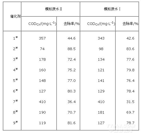 分別取模擬廢水Ⅰ和Ⅱ各100 mL,投加二氧化氯溶液2 mL(1.0%的水溶液)和自制催化劑(浸漬染料廢水)4.0 g,調節水樣的pH=3~5,室溫下振蕩反應60 min。測定反應后的CODCr值,計算CODCr去除率,結果見表2。