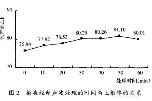 由圖2可知,較未經超聲波處理而言,染液經由超 聲波處理后,織物上染率更高。處理時間在30min之前, 上染率提高趨勢明顯,而30min之后上染率提高趨勢平 緩。這是由于在染整加工中,染料的聚集狀態對染色效 果有直接的影響。染料的上染必須以單分子態來完成。 染液中染料分子或離子的聚集體顆粒越細小,染料消耗 越小,所得到的顏色越鮮艷、飽滿,牢度越好。經超聲波 處理后,染料顆粒明顯變小了,從而使染料在分散介質 中分布更均勻,因此,染液經由超聲波處理后,其上染率 獲得較大改善。