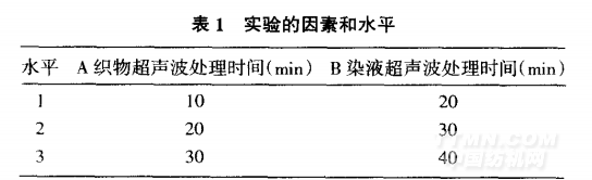 正交實驗 為了進一步比較超聲波處理織物和染液對織物上 染率的影響,分別選取織物進行超聲波處理的時間、染 液進行超聲波處理的時間進行試驗,各因素選取1.5中 單因素試驗上染率較優的兩變量進行正交試驗,表頭設 計如表1所示,以Na2s0 為促染劑,Na CO,為固色劑, 染色浴比為l:20,測定各組染色織物總色差△E值。列 舉試驗見表2。