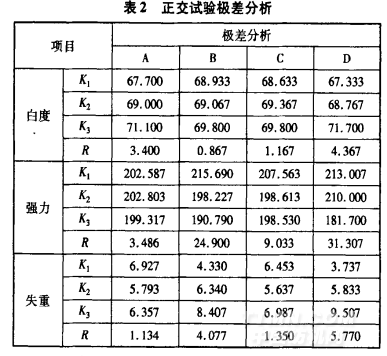 根據(jù)實(shí)際生產(chǎn)的主要影響因素,選定雙氧水用量(A)、氫氧化鈉用量(B)、硅酸鈉用量(C)和溫度(D)為影響因素,進(jìn)行IJ9(34)正交試驗(yàn)。由于織物處理后的毛效在18c瑚/30min左右,不再作為重要參數(shù)考查。