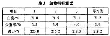 優化工藝處理織物自度為71.2%,比傳統煮漂一浴法高7%,達到蹦TOl“8中1級標準;強力218.2 N,達到蹦T72004.1_2000 l級標準。因此,最佳試驗方案兼顧了白度、強力和失重,使三者同時處于較好的水平得到較好的處理效果。