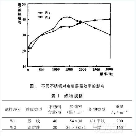由不銹鋼短纖維混紡紗制成的織物與不銹鋼長(zhǎng)絲混紡制成的織物進(jìn)行實(shí)驗(yàn)對(duì)比,其屏蔽效率差異較大,如圖1所示。