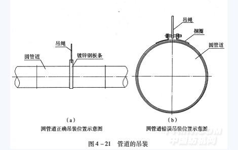 7)管道吊裝要合理,一般情況下要求直管道每4m安裝一個吊繩,如有其他裝置(如金屬、火星探除器等)或管道拐角處,需另外增加吊繩。建議吊繩采用φ6mm的圓鋼,也可利用棉包的捆絲以節約成本。當用φ6mm的圓鋼吊裝時,應先將0.75mm厚、60mm寬的鍍鋅鋼板條或棉包的捆絲固定在圓管道上,再用圓鋼吊裝該鍍鋅鋼板條或捆絲即可。如果用棉包的捆絲吊裝圓管道,可直接用捆絲捆綁管道進行吊裝。吊繩應放在管道的中間位置[圖4?21(a)],最好不要吊在捆圈耳上[圖4?21(b)],以免捆圈耳處焊接不牢而脫落。管道安裝完畢后,需要進行空車及過棉試驗。