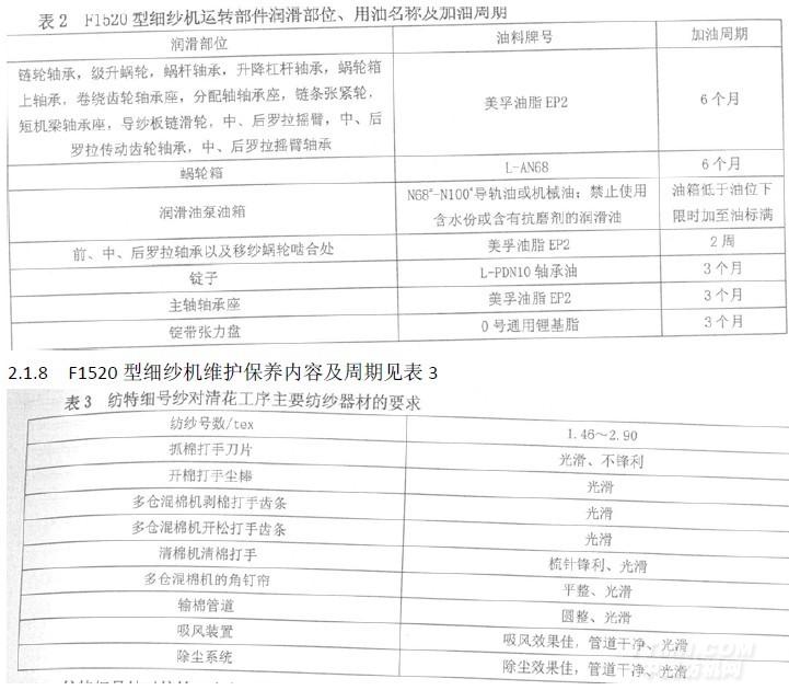 2.1.7滴油潤滑裝置在排除故障,調整油量或進行手動供油時,必須切斷電源,使油泵排油一次完成,活塞完全復位后。再進行操作。F1520型細紗機運轉部件潤滑部位、用油名稱及加油周期見表2。