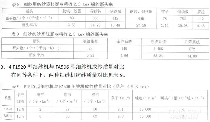 從表9可以看出,在F1520型細(xì)紗機(jī)紡紗速度高出FA506型細(xì)紗機(jī)15%的情況下,成紗質(zhì)量明顯優(yōu)于FA506型細(xì)紗機(jī),尤其是千錠時(shí)斷頭降低幅度明顯,充分體現(xiàn)了該機(jī)的高產(chǎn)能及高速的運(yùn)行效率,是棉紡企業(yè)擴(kuò)大看錠數(shù)、減少用工成本、提高經(jīng)濟(jì)效益的重要途徑。