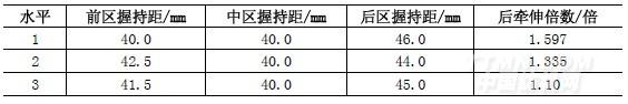 2.1對影響質(zhì)量的主要工藝參數(shù)、羅拉握持距、后區(qū)牽伸倍數(shù)等因素做了四因素三水平正交試驗