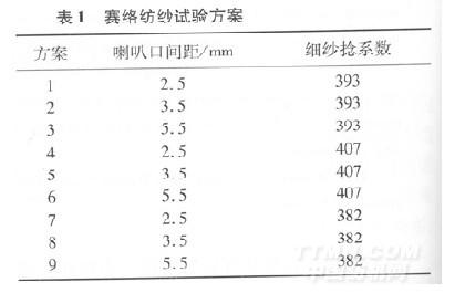 細紗機錠速13 800 r/min,鋼領直徑38 mm,鋼絲圈型號L型1I/0號,總牽伸62.70倍,后區牽伸1.35倍,鉗口隔距2.5 mm,羅拉加壓(雙錠)157 N×127 N×147 N。我們選擇對賽絡紡紗質量影響較大的喇叭口間距和細紗捻系數進行試驗優選。