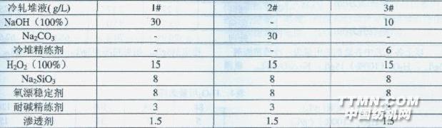 1試驗 1.1試驗材料與設備 1.1.1織物規格 40sx24s/1 26根/in.x67根/in.59in. 1.1.2染化料助劑 NaOH,H2O2,Na2Si03,Na2CO3,冷堆精練劑,滲透劑,氧漂穩定劑,螯合分散劑 1.1.3染整儀器設備 Datacolor SF600測色儀,Hounsfield H10KS拉伸強力儀,YGB毛效測試儀,Elmendorf撕破強力儀,SDL織物懸垂儀,平幅精練機,燒毛機,智能高溫高壓溢流染色機 1.2前處理工藝流程 平幅精練→冷軋堆→高效水洗→燒毛→漂白→中和(3g/L HAC,70℃x10min)→纖維素酶拋光→滅活(85℃x20min) 1.2.1冷軋堆工作液組成/(g/L)表1冷堆液配方工藝