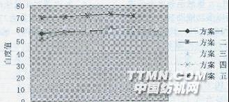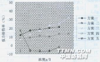 從圖2可清楚看到,方案5的白度在70~80之間,其它幾個(gè)方案的白度值僅60左右。 圖3 不同方案強(qiáng)力損傷率