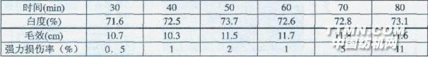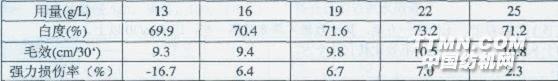 從上表數(shù)據(jù)可知,隨多功能助劑用量增加,織物的白度增加,毛效也越好,但強(qiáng)力下降較快。當(dāng)多功能助劑用量超過(guò)22 g/L,雖然毛效度有所提高,但是強(qiáng)力開(kāi)始下降。所以多功能助劑用量最好不要超過(guò)25g/L。當(dāng)用量低于16 g/L時(shí),白度和毛效