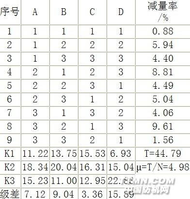經Cu2+處理后H2O2預處理條件選擇各因子水平如下: A——反應溫度(℃) A1=40 A2=55 A3=70; B——H2O2(30%)濃度(ml/L) B1=10 B2=20 B3=40 C——反應pH值 C1=5.5 C2=7 C3=8.5; D——反應時間(min) D1=30 D2=60 D3=90 由極差數據:各因子對減量率的重要性依次為:D>B>A>C,即最重要的反應條件為時間,H2O2濃度次之,再有溫度??梢?,在相同酶處理條件下,減量率受H2O2反應中影響因素的主次順序與影響二硫鍵減少的一致。即隨著時間的延長和H2O2濃度的增加,Cu2+-羊毛催化H2O2分解生成HO.的量急劇增加,二硫鍵的量快速下降,減量率快速增加。因此進一步證明了預處理對蛋白酶催化水解羊毛的促進作用主要在于破壞二硫鍵。H2O2的氧化作用、氯劑的氧化作用、Na2SO3還原作用都會對胱氨酸的二硫鍵產生一定的破壞作用(反應如式3-1,3-2),有利于蛋白酶分子的進攻,這與前面的試驗結果相符。氧化: