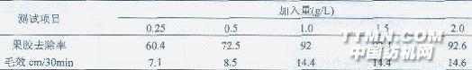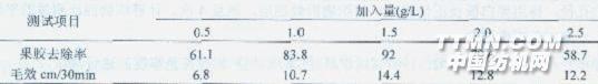 注:JFC加入量1.5g/L,浴比1:10,溫度55℃,pH=8.0,時(shí)間50min2.3非離子表面活性劑JFC加入量對(duì)復(fù)配體系精練效果的影響 表4 JFC加入量對(duì)復(fù)配體系精練的影響結(jié)果