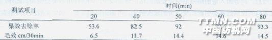 注:酶加入量1.Og/L,浴比1:10,溫度55℃,pH=8.0,時(shí)間50min 由表4可以看出,JFC的加入對(duì)體系精練效果的影響較為重要,隨著JFC用量的增加織物的果膠去除率和毛效均早上升趨勢(shì)。當(dāng)用量為1.5g/L時(shí)達(dá)到最大值,進(jìn)一步增加效果反而降低。這是由于非離子表面活性劑對(duì)酶制劑的雙重影響作用導(dǎo)致的,低濃度范圍內(nèi)對(duì)酶有激活作用,而高于一定的濃度又會(huì)起到抑制作用。因此,確定JFC的加入量為1.5g/L。2.4時(shí)間對(duì)復(fù)配體系精練效果的影響 由表5可以看出,隨著處理時(shí)間的延長(zhǎng),果膠去除率和毛效均依次增大。當(dāng)處理時(shí)間為50min時(shí)精練效果基本趨于穩(wěn)定,繼續(xù)延長(zhǎng)時(shí)間,精練效果無明顯變化。從上面的結(jié)果可以看出,與棉針織物的纖維素酶除毛工序相比,酶精練所需時(shí)間更長(zhǎng)。這是因?yàn)椋环矫娉且粋€(gè)在織物表面進(jìn)行的過程,而精練卻是對(duì)織物整體進(jìn)行的處理;另一方面,除毛所用的棉針織物是經(jīng)過前處理的,其潤(rùn)濕性能好,纖維素酶易與其作用,而精練所用的針織坯布,其潤(rùn)濕性能差,酶制劑不易與其結(jié)合,需借助非離子表面活性劑的溶脹作用才能滲透到織物內(nèi)部與其發(fā)生作用,因而所需時(shí)間較長(zhǎng)。 表5時(shí)間對(duì)