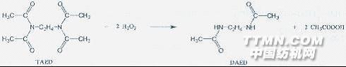 圖1 雙氧水與TAED生成過乙酸的方程式 本研究采用廣角x-射線衍射、紅外光