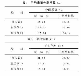 堿精練和生物前處理棉布的表觀平均色度如表2所示。