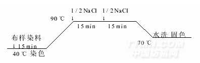 直接染料染色工藝流程、染色[大紅4BS(owf)x%,食鹽4g/L,浴比1∶50]→固色(固色劑Y1mL/L,溫度70℃,時間20min,浴比1∶50)→水洗→皂洗(洗衣粉5g/L,92℃×5min)→水洗→烘干