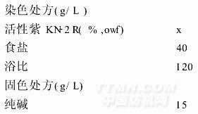 活性染料染色工藝流程(一浴二步法)、布樣→染色(60℃×15min→加1/2NaCl,15min→加1/2NaCl,15min)→固色(Na2CO315g/L,浴比1∶20,時間30min)→皂洗(92℃×5min)→水洗→烘干