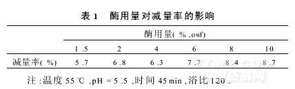 從表1可知,隨酶用量增加,減量率增大。浴比一定時,酶用量越大,纖維素酶濃度越高;在相同時間下,纖維素酶水解的纖維素越多,減量越大,織物強力下降越大。若減量過小,雖然強力下降不大,但整理效果不理想。考慮到織物的強力,應盡量避免纖維素酶過量。酶用量選擇2%(owf)較適宜。