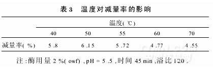 從表3可以看出,在一定溫度范圍內,隨著溫度升高,棉纖維的減量率也隨之增大。溫度對酶活力影響較大,溫度升高,活化分子數增加,有利于催化反應,但溫度太高,酶蛋白會逐漸變性失活。考慮到酶活力及酶在處理過程中的熱穩定性,反應溫度以60℃為宜。
