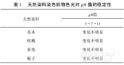 由表3可見,蘇木、檳榔、黃蓮、梔子的稀土染色織物對pH值有較高的色光穩定性,這對拓展稀土媒染劑在植物染料染色中的應用有十分重要的意義.
