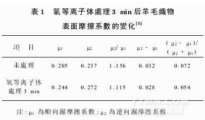 經(jīng)過等離子體處理的羊毛纖維,用掃描電子顯微鏡觀察(放大3000倍)發(fā)現(xiàn),鱗片主體基本完整,而多處鱗片尖角芒刺被打鈍,鱗片“起翹角”變小。進(jìn)一步放大(10000倍)觀察,可見羊毛纖維鱗片表面在等離子體處理時(shí)被刻蝕的大量痕跡。這種表面微觀粗糙度的增加和纖維抱合時(shí)接觸面積的增加,導(dǎo)致了纖維表面摩擦系數(shù)的提高。表1為經(jīng)氧等離子體處理3min后羊毛表面摩擦系數(shù)的變化。