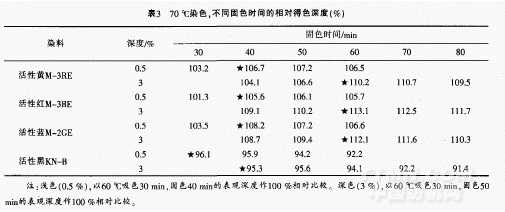 (1)從表1可看出,在60℃條件下打浸染樣時(shí),達(dá)到染色平衡所需的固色時(shí)間相對(duì)較長(zhǎng).淺色(0.5%,owf),需60rain左右,深色(3%,owf),需80min左右。顯然.13常打浸染樣的固色時(shí)間(淺色30-40min.深色40~50min),是達(dá)不到染色平衡的。其得色深度與達(dá)到染色平衡時(shí)相比,一般要低5%一l2%。而且,染料的品種不同,得色深度下降的幅度還不一樣。