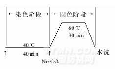 按1.4.1配方,將染料等依次加入染色杯中,按浴比1∶20加入蒸餾水.染色纖維質量為2g,染色工藝流程為