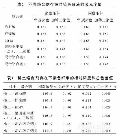 由表2可知:(1)在染色條件下,當(dāng)絡(luò)合劑中加入稀土溶液后,稀土能起促染作用,尤以混合絡(luò)合劑效果為好;(2)在固色條件下,當(dāng)絡(luò)合劑中加入稀土溶液后,稀土仍能起促染作用,但與染色條件相比,固色條件下染色殘液的吸光度值比染色條件下殘液的吸光度值要高,從所用6組絡(luò)合劑的測(cè)定結(jié)果來(lái)看,使用絡(luò)合劑后可以減弱稀土離子的水解程度,增加促染效果.但如果絡(luò)合劑太穩(wěn)定,除了防止稀土離子水解外,受絡(luò)合平衡的影響,會(huì)將已與織物作用的部分稀土離子剝落下來(lái),導(dǎo)致上染率下降;絡(luò)合劑不太穩(wěn)定時(shí),由于稀土離子氫氧化物的溶度積小,水解效應(yīng)強(qiáng)于絡(luò)合效應(yīng),雖然染液中沉淀量較常規(guī)染色法減少,但對(duì)織物的上染率變化不明顯.綜合上述2種原因自行配制的混合絡(luò)合劑要優(yōu)于單一絡(luò)合劑,可以較好地克服水解效應(yīng)和絡(luò)合效應(yīng)對(duì)染料上染過(guò)程中的不利因素,提高染色織物的相對(duì)濃度和總色差,降低染色殘液的吸光度值,提高染料的利用率.因此,使用更為理想的混合絡(luò)合劑對(duì)提高染色織物的相對(duì)濃度和艷度是非常有益的.