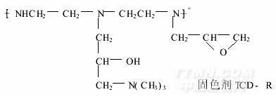 用二乙烯三胺與環氧氯丙烷反應,再用季銨鹽醚化劑醚化而成,反應性固色劑分子上引入季銨鹽.