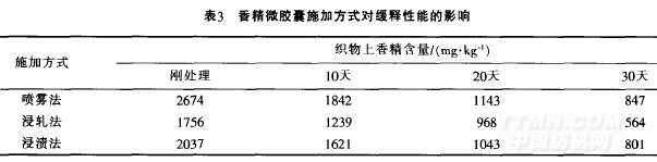 織物上,由于微膠囊和織物作用形式不同,織物上香精數量不同,從而對緩釋性能帶來了影響,測試結果見表3。