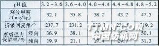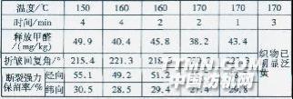 由表2可見,pH值越低,襯布釋放甲醛量越少,折皺回復角越大,但斷裂強力保留率也更低。根據質子催化理論,樹脂整理液酸性越強,樹脂與纖維分子形成共價鍵越多,未反應的樹脂則越少,襯布釋放甲醛量必然減少。由于樹脂與纖維素大分子間共價交聯反應充分,有利于提高襯布的折皺回復角,但強力下降也更嚴重。在襯布釋放甲醛量和折皺回復角達標的前提下,要盡量降低襯布強力損傷,提高內在質量。另外,棉纖維不耐酸,在酸性條件下易水解使強力下降。平衡襯布釋放甲醛量和斷裂強力保留率,確定防皺整理工作液pH值為4.0~4.4。3.1.3焙烘溫度和時間的影響 固定防皺整理劑、氯化鎂和甲醛捕捉劑用量,樹脂整理液pH值4.2,調整焙烘溫度和時間,測定整理襯布性能見表3。表3焙烘溫度和時間對整理襯布性能的影響