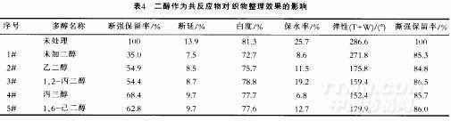 (2)織物的斷強和斷裂延伸度.在加入二醇和甘醇后.織物的斷強和斷裂延伸度都有明顯的提高.其原因可能是交聯程度降低造成的。