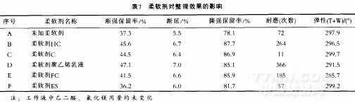 織物經乙二醛整理后.雖然彈性得到了較大改善和提高,但手感硬板、撕破強度降低.丁作液中加入適當柔軟劑.可改善整理織物的手感.