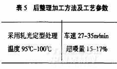 為了充分體現吸濕排汗纖維的優良性能。使產品具有良好的舒適感以及尺寸穩定性好、收縮率小和色澤鮮艷。在生產中要嚴格加強對溫度控制,適當選擇車速,使整理后的針織物具有獨特的風格。其工藝參數見表5。