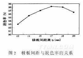 試驗選用直接大紅染料,配制200mg/kg(ppm)的溶液試樣6組,分別加入少量食鹽,調(diào)整pH=9,電流為2A,攪拌轉(zhuǎn)速80r/min,電解5min,測定溶液脫色前后的吸光度,計算脫色率。圖2給出了不同極板間距時,溶液的脫色率。在本試驗條件下,最佳極板間距在17mm附近。