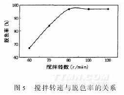 確定攪拌轉速。配制2000mL、200mg/kg直接大紅染料試樣5組,各加入食鹽3g,聚丙烯酰胺0.025g,調整pH=9,電流為2A,每組試樣選用一種電機轉速,反應5min后,測定各試樣的脫色率。試驗結果如圖5所示。