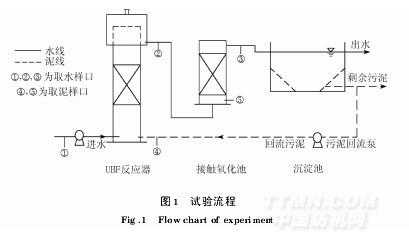 試驗(yàn)所采用的UBF反應(yīng)器,由有機(jī)玻璃制成,尺寸為008m×160m,有效容積為65L,水封高度為03m,填料為懸浮型NPL(聚丙烯球形中空填料),填料高度(接觸區(qū))為050m,污泥區(qū)高度為05m,各進(jìn)出水管及取樣管直徑均為20mm.接觸氧化池尺寸為010m×050m,有效容積為350L,填料為盾式填料(組合填料),曝氣采用CX—2500空氣泵.試驗(yàn)流程如圖1所示.