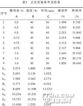 結(jié)果分析:隨著處理時(shí)間的延長(zhǎng),纖維的減量 率升高,手感柔軟,纖維表面毛羽明顯減少,降強(qiáng)率 也顯著增加。對(duì)于苧麻纖維來(lái)說(shuō),減量不超過(guò)5%, 降強(qiáng)率不超過(guò)15%,即可保證織物的品質(zhì)。因此, APL適宜處理時(shí)間為40~50 min。 本實(shí)驗(yàn)所用的酶用量是以對(duì)織物重計(jì)算的,故 可不計(jì)浴比的影響。攪拌是在耐洗色牢度試驗(yàn)機(jī)理 進(jìn)行的,其轉(zhuǎn)速為40r/min,未討論攪拌的影響。 由于上述實(shí)驗(yàn)用布不是同一塊退煮布,所以存 在處理效果的差異。同時(shí)不同組實(shí)驗(yàn)間也存在差 別,因此數(shù)據(jù)不盡一致。 2.2.5 APL纖維素酶的正交實(shí)驗(yàn)