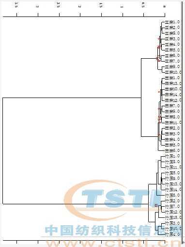 使用驗證集樣品的近紅外光譜圖對各判別模型進行準(zhǔn)確度驗證,在與建模樣品相同的條件下,使用漫反射方法分別采集四種竹原纖維、苧麻和亞麻驗證集樣品的近紅外光譜圖,進行一階導(dǎo)數(shù)+矢量歸一化預(yù)處理后,對判別模型進行準(zhǔn)確度驗證。驗證集樣品的近紅外光譜圖(部分列舉)見圖3,近紅外光譜判別模型驗證結(jié)果(部分列舉)見圖4,綜合判別模型驗證結(jié)果如表2所示。