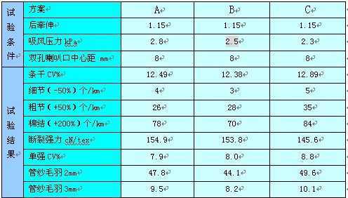 根據對比試驗確定,吸風壓力在2.5KPa時條干、棉結、毛羽等指標優于或同等于2.8KPa時的指標,在考慮節省能源成本,紗線質量好的前提下,選擇方案B:2.5KPa的吸風壓力。