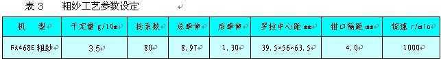 為了加強對牽伸區纖維的控制,粗紗工藝采用“小隔距、輕定量、中檔加壓、較小的后區牽伸、低速度”的工藝配置原則。由于細紗采用賽絡紡雙根粗紗喂入,粗紗定量宜偏輕掌握,定量為3.5g/10m。賽絡緊密紡細紗退繞時引紗距離比普通環錠紡引紗距離長,張力較大,粗紗退繞時容易產生斷頭,為保證粗紗正常退繞,在細紗不出“硬頭”的前提下,適當增大粗紗捻系數,即可減少粗紗退繞時意外伸長,又可賽絡緊密紡時增加細紗前區須條緊密度,從而減少成紗細節及毛羽,提高成紗強力,但粗紗捻系數不易過大,否則細紗牽伸不開吐硬頭。一般粗紗捻系數掌握在75~80之間,我公司采用80捻系數。為確保粗紗品質,適當降低錠速。小紗錠速為900r/min,大紗為950r/min,,中紗采用1000r/min,可以減少斷頭率,保證粗紗生產正常運行。