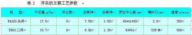 特呂茨勒的TD03并條自調勻整系統屬于全伺服形式,該系統采用的是漏斗式傳感器測量棉條的靈敏度,準確率很高,且換筒期間的減速和加速過程也被勻整,因此保證了每米質量的最優化。并條工序的工藝設計對纖維的混合及成紗的條干質量起著關鍵性的影響,特別是牽伸倍數及其分配的設定、羅拉隔距大小的確定,直接影響著熟條的條干和棉結。針對粘膠纖維的特性,為保證纖維之間的充分混合和降低成紗重量不勻率,并條工序采用二道并合的方式,以“小隔距、小張力”的工藝原則。為改善熟條條干,二并采用較小的后區牽伸倍數,同時采用偏小的牽伸羅拉隔距。并條工序的主要工藝參數見表2: